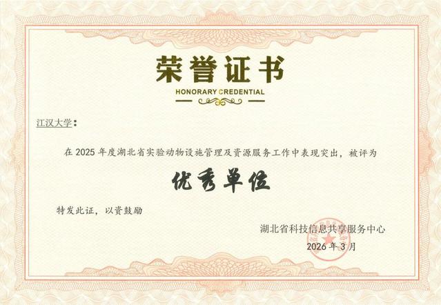 近日,由湖北省科学技术厅指导,湖北省科技信息研究院、武汉大学实验室与设备管理处、中国科学院武汉病毒研究所国家病毒资源库联合承办的科技资源共享高质量发展大会在武汉召开。江汉大学在2025年度全省实验动物设施管理与资源服务工作中表现突出,被授予2025年度湖北省实验动物设施管理及资源服务优秀单位荣誉称号,充分展示了学校在实验室条件建设、规范管理与教学科研保障方面取得的成效。